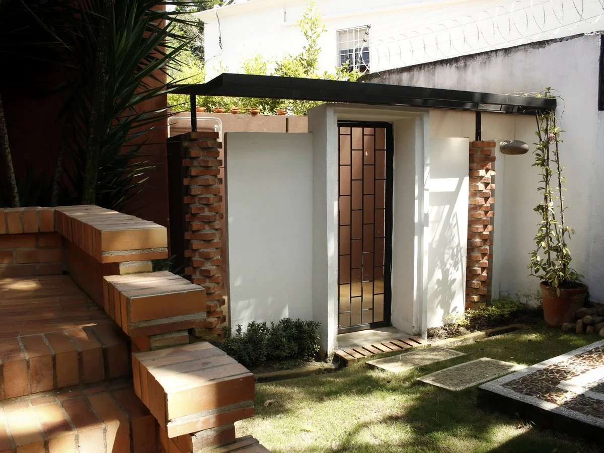 Cada apartaestudio aporta al conjunto un cerramiento cerámico. Dos cerramientos idénticos en ladrillo rústico tienen por función proveer de seguridad hacia la calle, consolidando accesos independientes, completando la paramentación de lo construido en relación al predio total y dando origen al jardín interior. Un tercer cerramiento, elevado levemente del suelo, define con claridad una terraza y jardín al servicio del apartaestudio, conservando un enorme árbol existente de más de 45 años y creando, mediante el voladizo de la viga que levanta el muro, una proyección que sirve como banca al exterior.