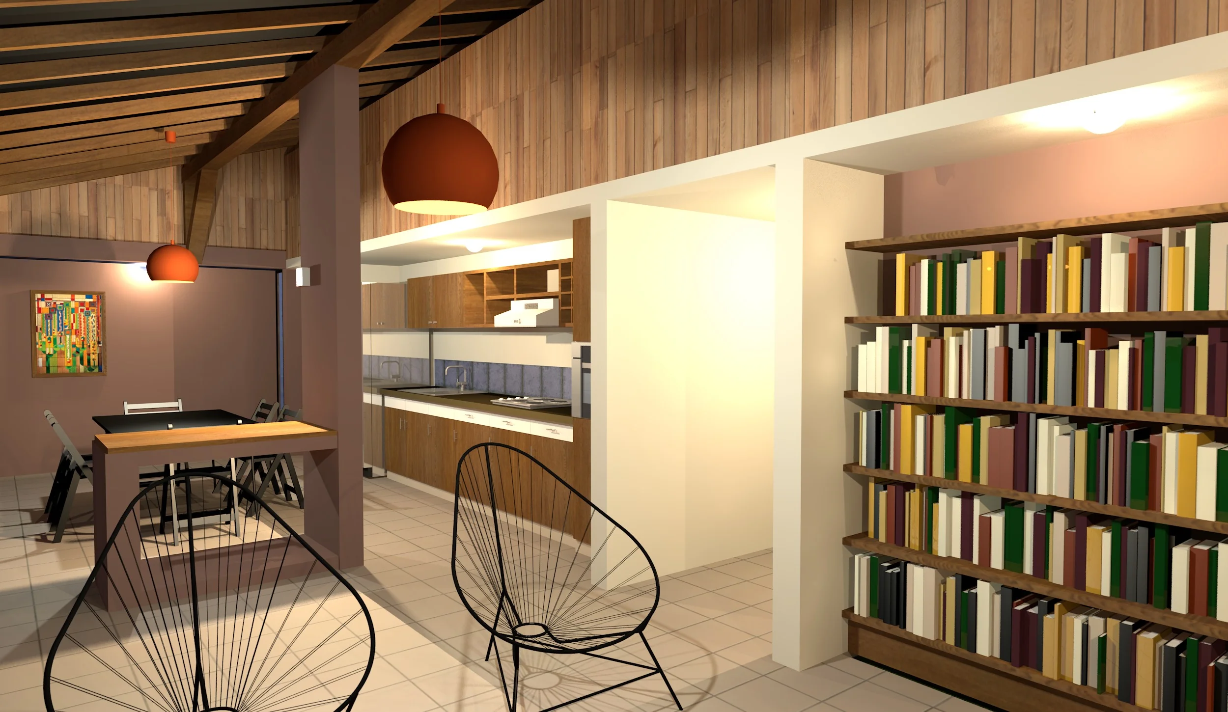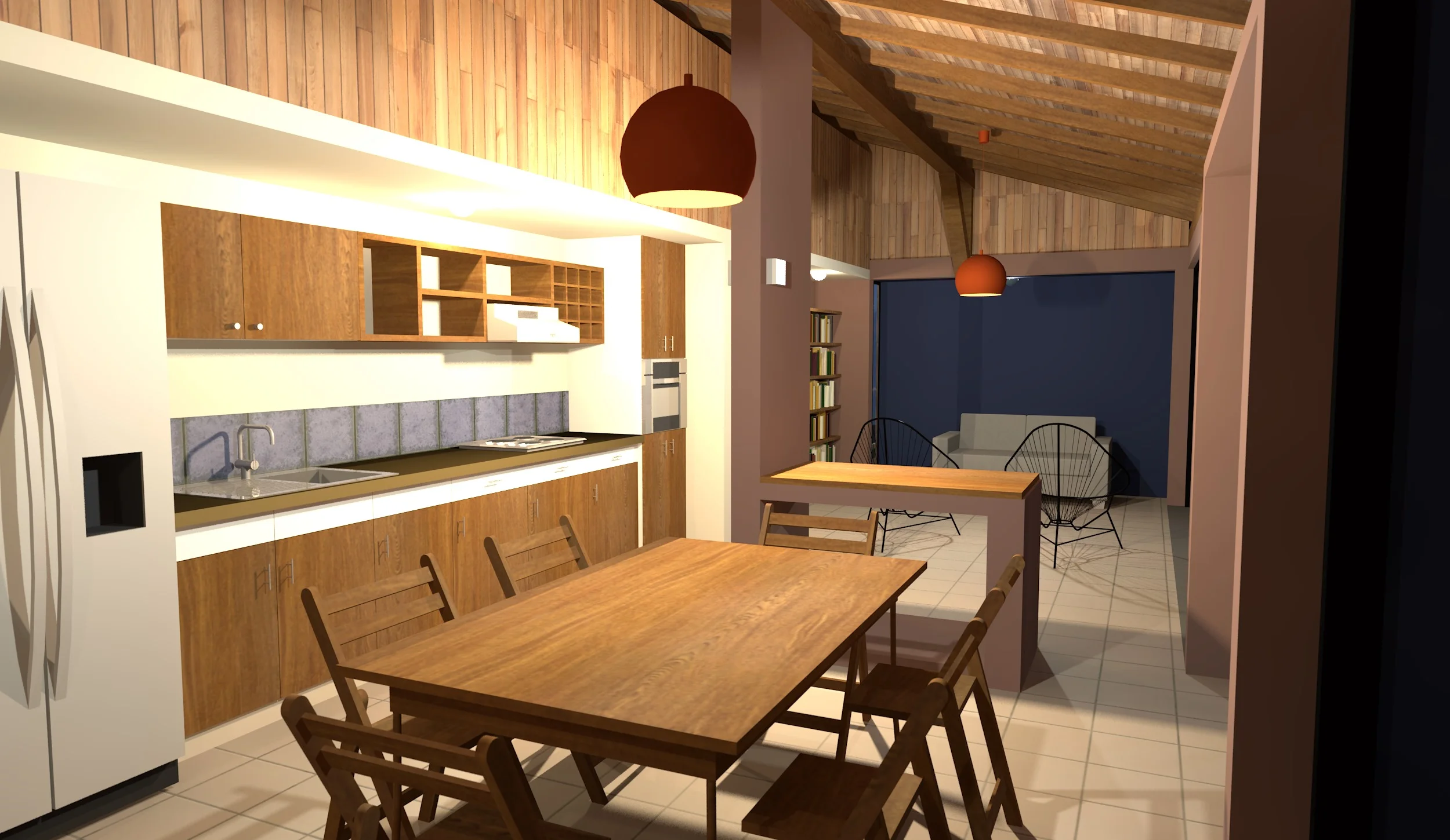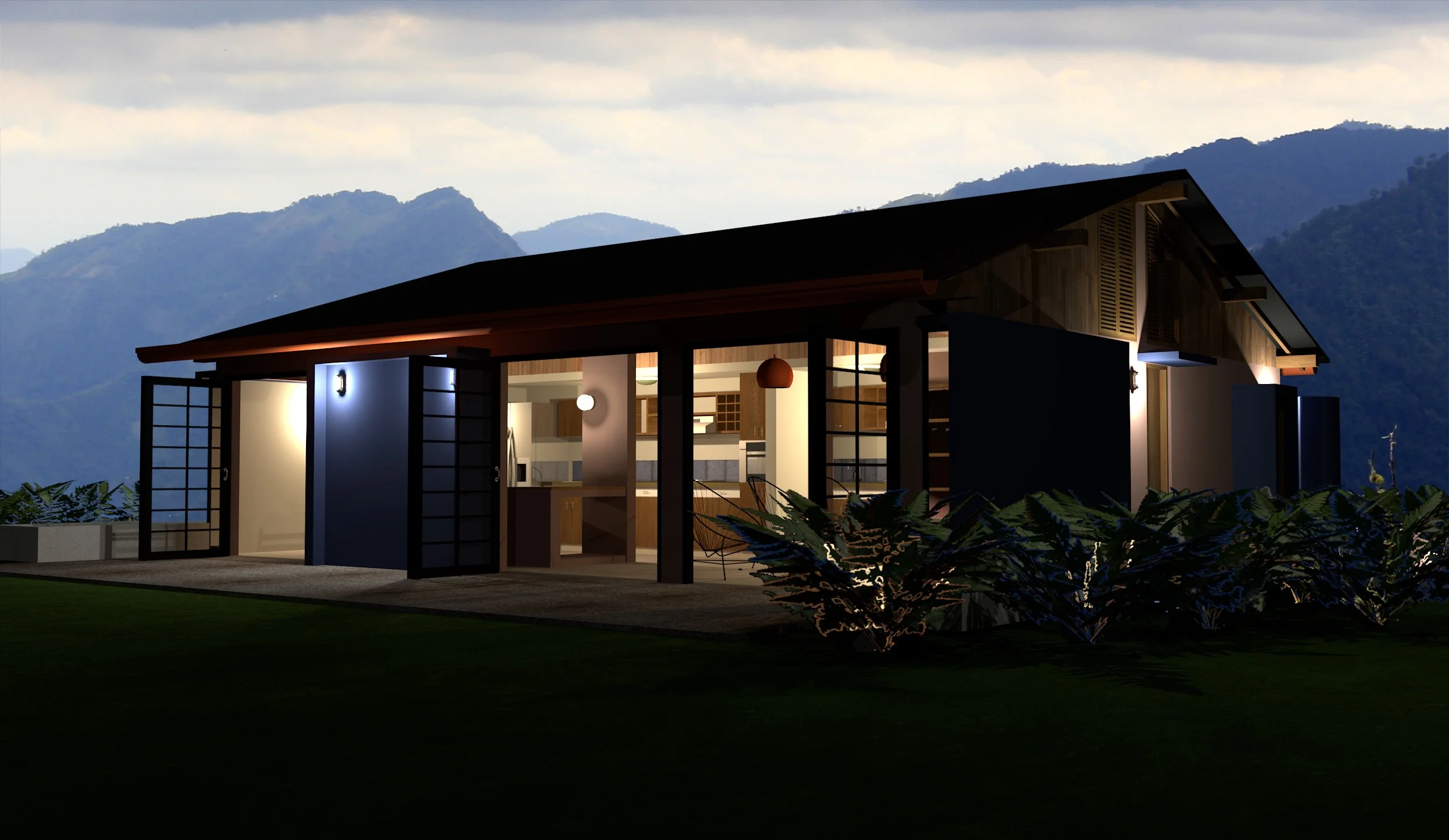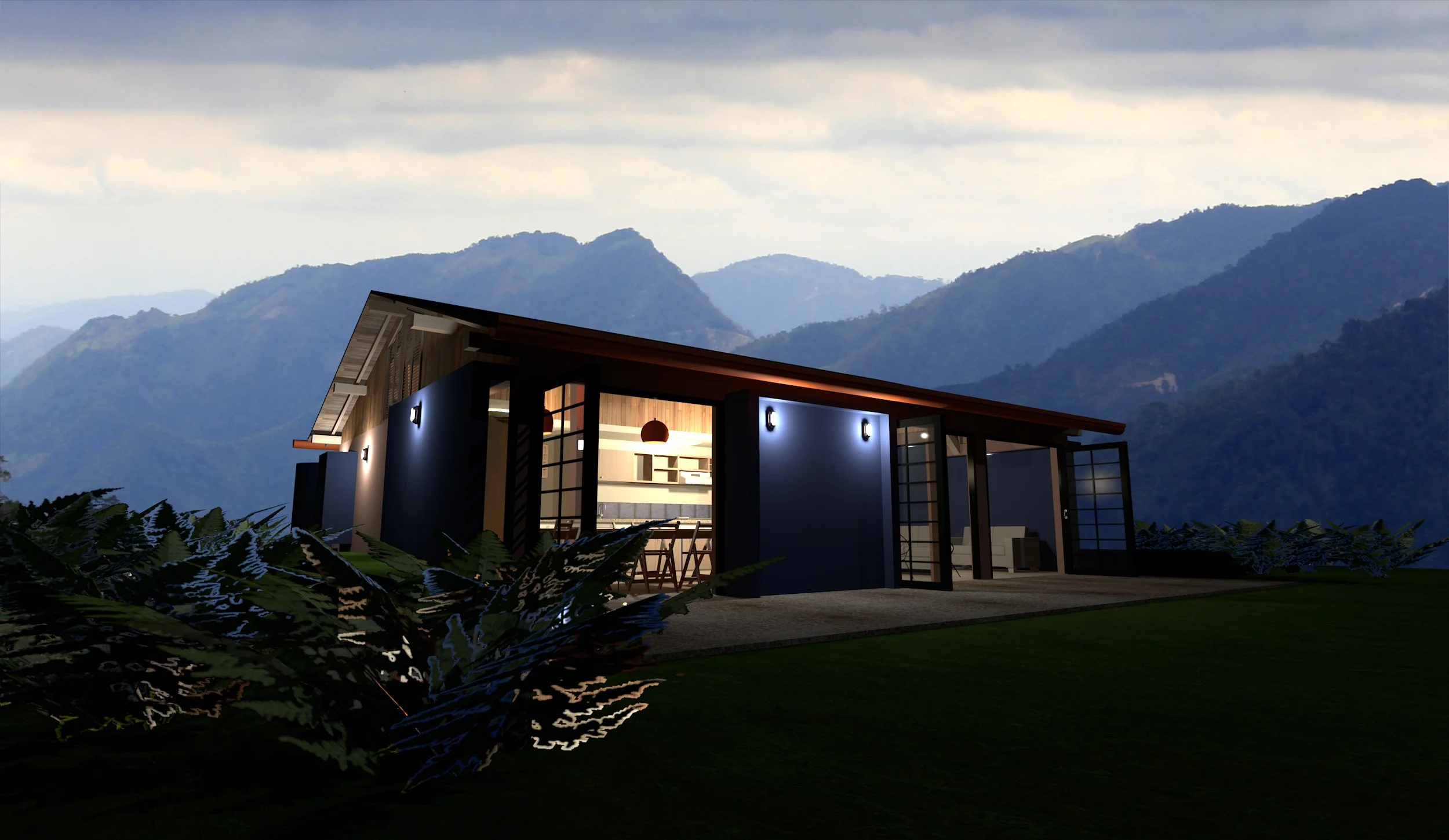 Zona social al frente: sala, comedor y cocina integrados, abiertos hacia el paisaje.