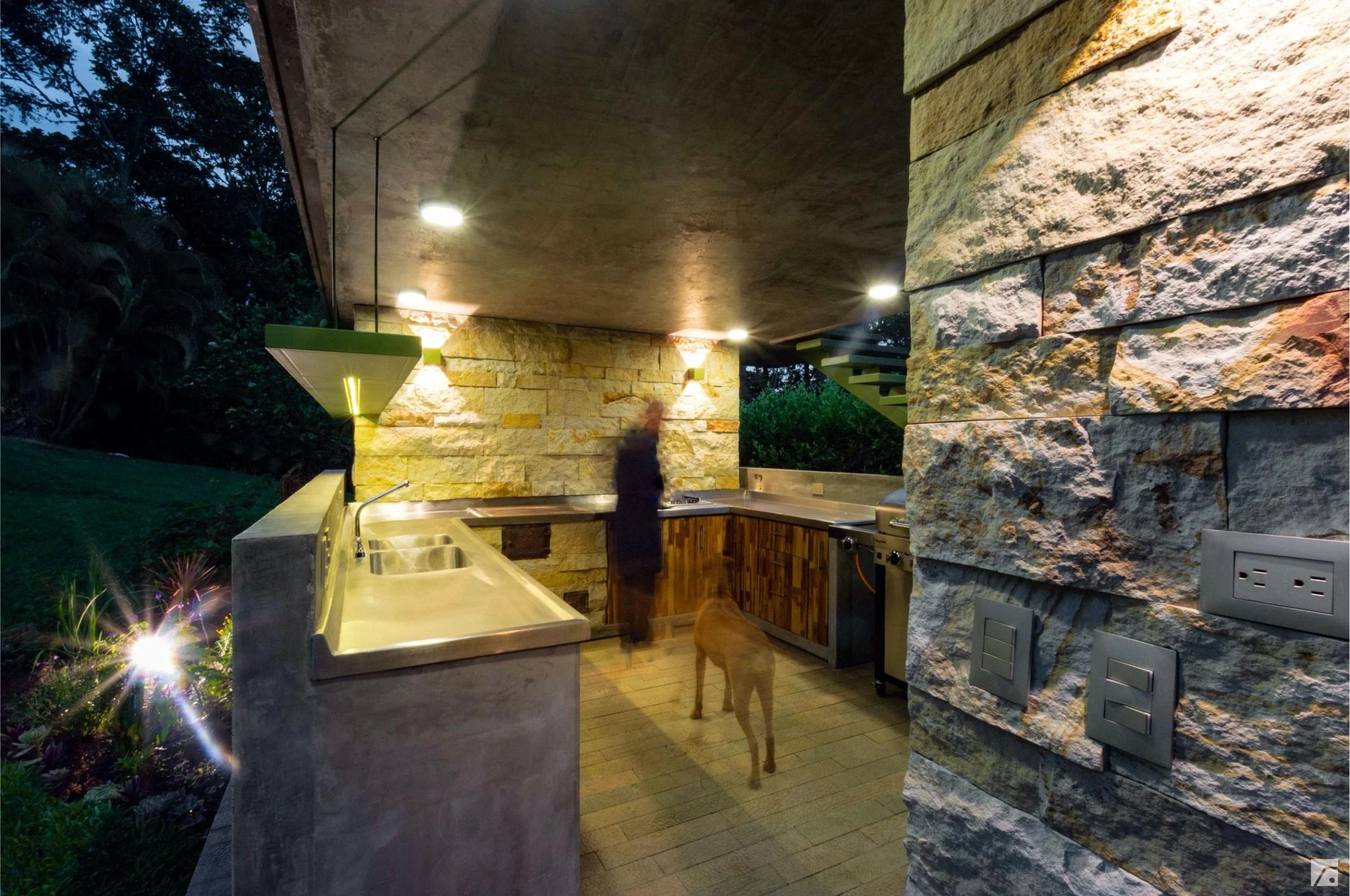 En la planta baja se diseñó un área con alto nivel de actividades sociales, orientada principalmente a una cocina abierta donde se conjugan las tradiciones y los saberes de la gastronomía colombiana. Los elementos preponderantes son una estufa de leña para preparaciones lentas, que permite en su transcurrir la integración familiar al tener un comedor adyacente de diez puestos construido en concreto, cuya sombra y confort térmico está dado por un árbol de mango de veinte años de antigüedad. La cocina abierta promueve una visual directa con la vivienda campestre preexistente y posee elementos adicionales como un “barbecue” y una estufa a gas para una amplia variedad de preparación de alimentos.